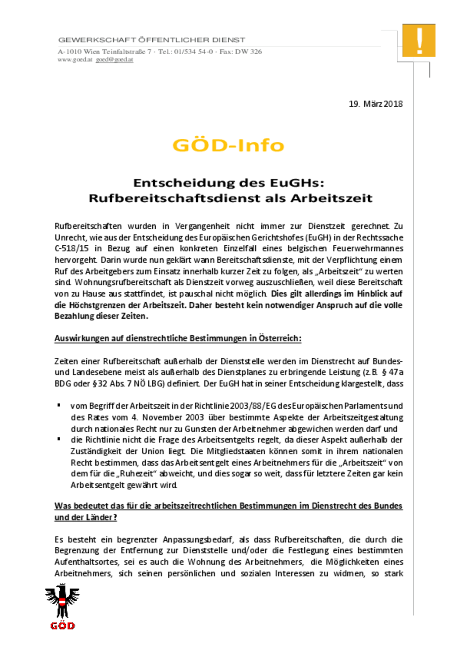 Zeiten einer Rufbereitschaft außerhalb der Dienststelle werden im Dienstrecht auf Bundes- und Landesebene meist als außerhalb des Dienstplanes zu erbringende Leistung (z.B. § 47a BDG oder § 32 Abs. 7 NÖ LBG) definiert. Der EuGH hat in seiner Entscheidung klargestellt, dass