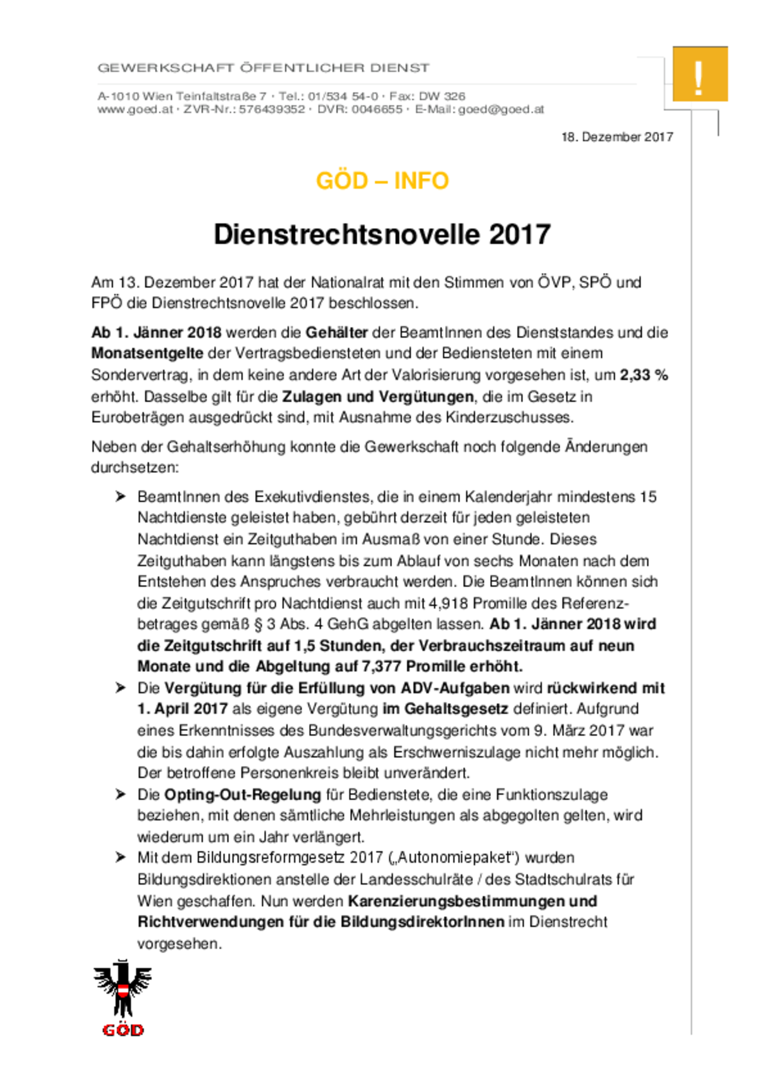 Neben der Gehaltserhöhung konnte die Gewerkschaft weitere Änderungen durchsetzen. Nähere Informationen entnehmen Sie der GÖD - Info vom 18.Dezember 2017 im Anhang.