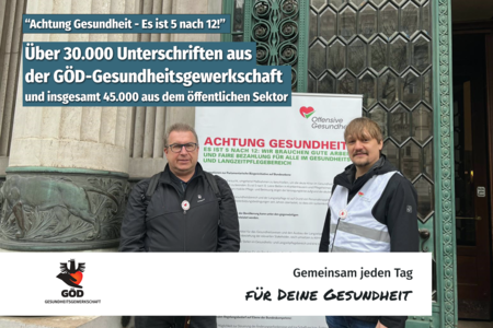 Vor einem Monat fiel der Startschuss für die parlamentarische Bürgerinitiative „Achtung Gesundheit - Es ist 5 nach 12!“. Diese wurde initiiert von der „Offensive Gesundheit“, die sich aus einem Zusammenschluss der Arbeiter- und Ärztekammer sowie der Gewerkschaften im Gesundheits- und Langzeitpflegebereich ergab. Die Bürgerinitiative, die bis zum „Tag der Gesundheitsberufe“ am 12. Mai 2022 laufen wird und für die eigentlich nur 500 Unterschriften notwendig wären, konnte inzwischen mehr als 50.000 Unterschriften sammeln. Mehr als 30.000 der Unterschriften stammen aus der GÖD-Gesundheitsgewerkschaft. „Und dies ist erst der Anfang. Wir sammeln weiter. Wir fordern mehr Personal, bessere Arbeits- und Ausbildungsbedingungen und dafür mehr finanzielle Ressourcen“, so Waldhör in Richtung Politik.